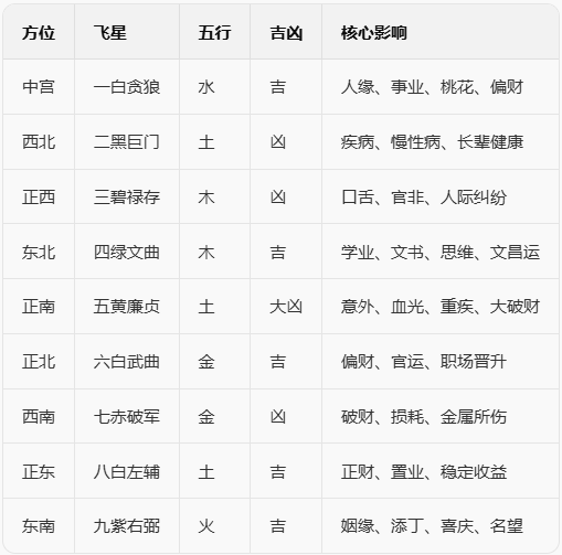 2026 年九宫飞星排盘(洛书顺飞)按紫白九星排盘公式(2026 年:9-(2+6)=1,一白入中),各宫飞星分布如下: